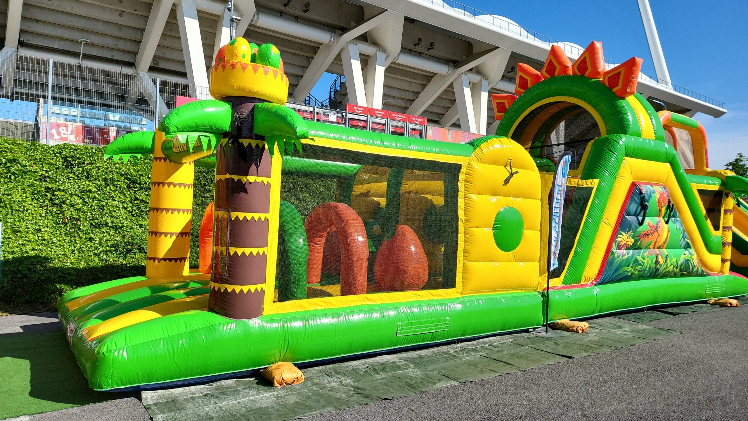 Il mesure 13 mètres de long et est réalisé sur le thème passionnant des dinosaures. Un parcours d’obstacles gonflable est un excellent moyen d’attirer un large public, enfants ou adultes. Traversez le parcours en courant, sautant, grimpant et rampant. Qui atteindra l’autre côté en premier ? Ce parcours d’obstacles gonflable est parfait pour une fête scolaire, une sortie d’entreprise ou tout autre événement festif.